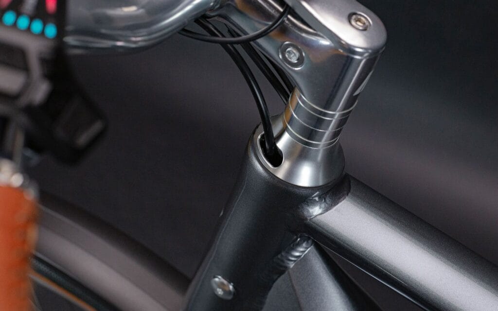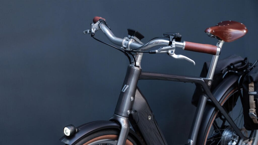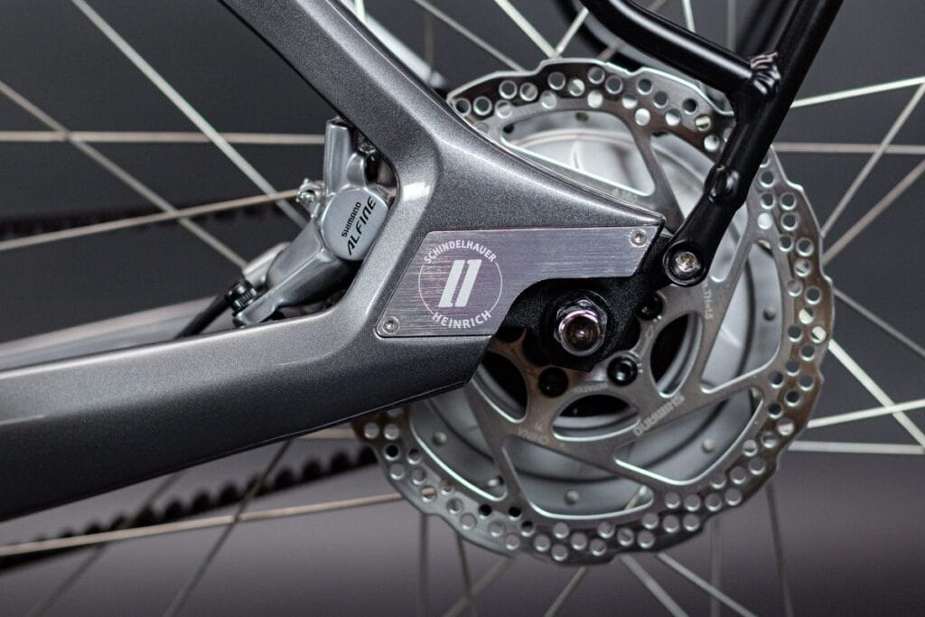 Aluminium (AL6061-T6), triple butted tubing , forged motor bracket, multi-cell down tube, forged dropouts with slider-belt-tensioning-system and Schindelhauer belt port, integrated seat post clamp, internal cable routing, smooth welded
